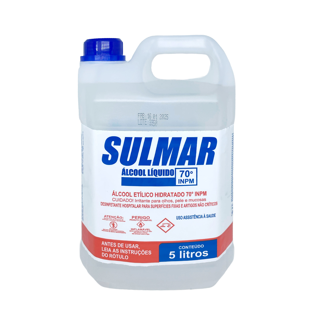 Álcool Líquido Hospitalar 70% INPM Sulmar – Galão 5L | Ideal para higienização e desinfecção de ambientes com alto padrão sanitário, ação comprovada contra vírus, bactérias e fungos | Indicado para restaurantes, cozinhas industriais, indústrias alimentícias, clínicas, hospitais, maternidades, consultórios, laboratórios, hotéis, academias, creches, escolas, escritórios e edifícios comerciais | Modo de uso: aplicar álcool diretamente sobre a superfície, espalhar com material descartável (papel-toalha ou pano), não reutilizar material usado, evitar aplicação sobre utensílios de cozinha, plantas e aquários | Concentração: 70% INPM, ação eficaz eliminando até 99,8% dos microrganismos com tempo de ação recomendado de cerca de 10 minutos | Composição: etanol, água deionizada, benzoato de denatônio e essência suavizante de odor | Volume: 5 litros, ideal para uso profissional e de alto fluxo | Vantagens: fácil aplicação, ótimo custo-benefício, baixo risco toxicológico | Precauções: inflamável, manter longe de fontes de calor e fogo, usar em áreas ventiladas, utilizar equipamentos de proteção e evitar contato prolongado com olhos e mucosas | Dimensões da embalagem: 29 cm (altura) x 18 cm (largura) x 11 cm (profundidade) | Linha Sulmar – referência em soluções antissépticas para ambientes limpos, seguros e protegidos. | Código: -8422