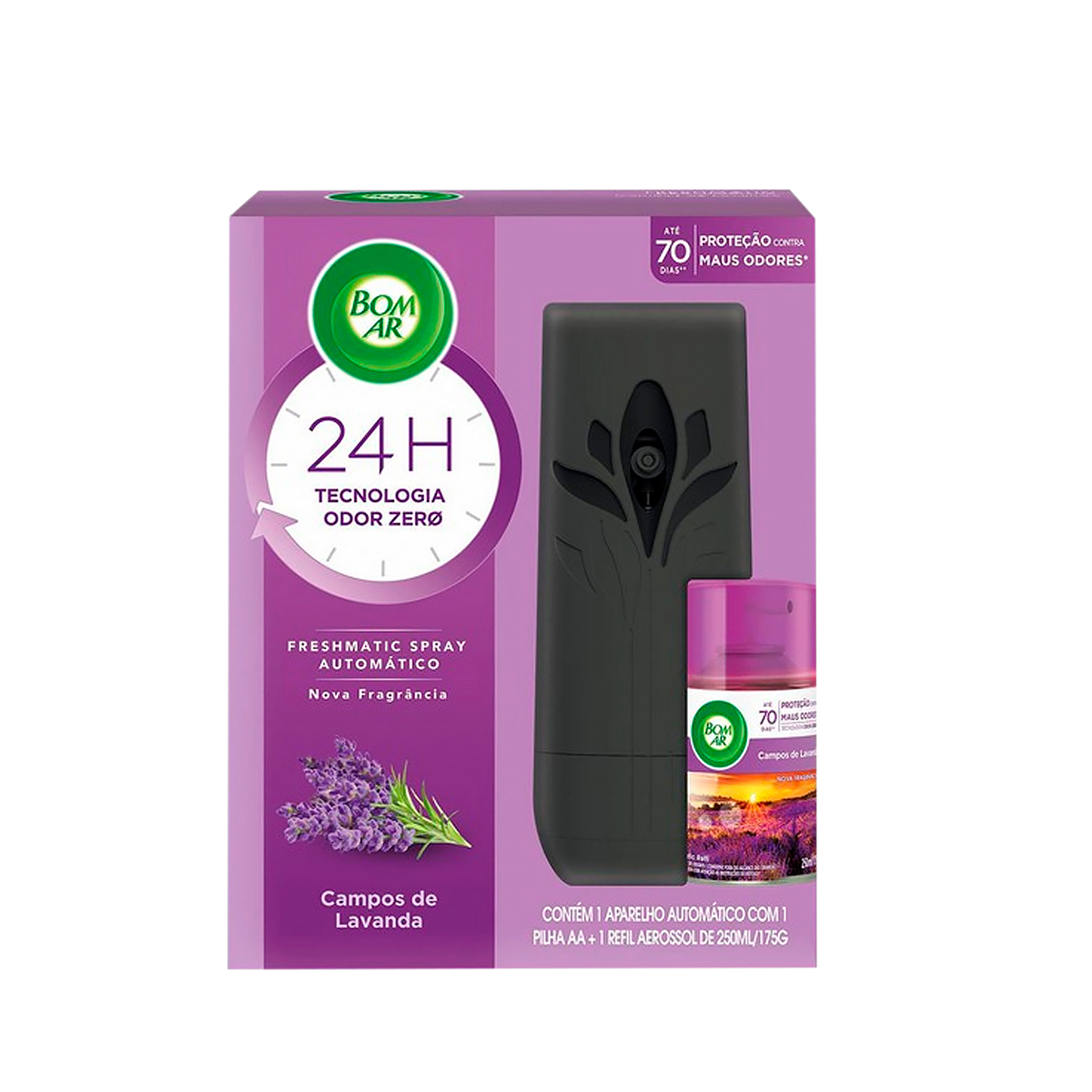 Aparelho Odorizador + Refil 250 mL Lavanda – Bom Ar | Mantém o ambiente fresco e perfumado com Tecnologia Odor Zero, neutralizando maus odores | Perfuma continuamente por até 24 horas após cada aplicação | Duração prolongada de até 70 dias na regulagem mínima | Três níveis de intensidade de fragrância para personalizar o aroma | Design moderno que combina com qualquer ambiente | Ideal para residências, escritórios, consultórios, hotéis e outros espaços | Conteúdo: Aparelho + Refil 250 mL | Composição: Solvente, fragrância e propelentes | Fragrância: Campos de Lavanda | Tecnologia: Odor Zero | Tamanho embalagem: 19,5 x 8,5 x 8,5 cm | Código: -3285