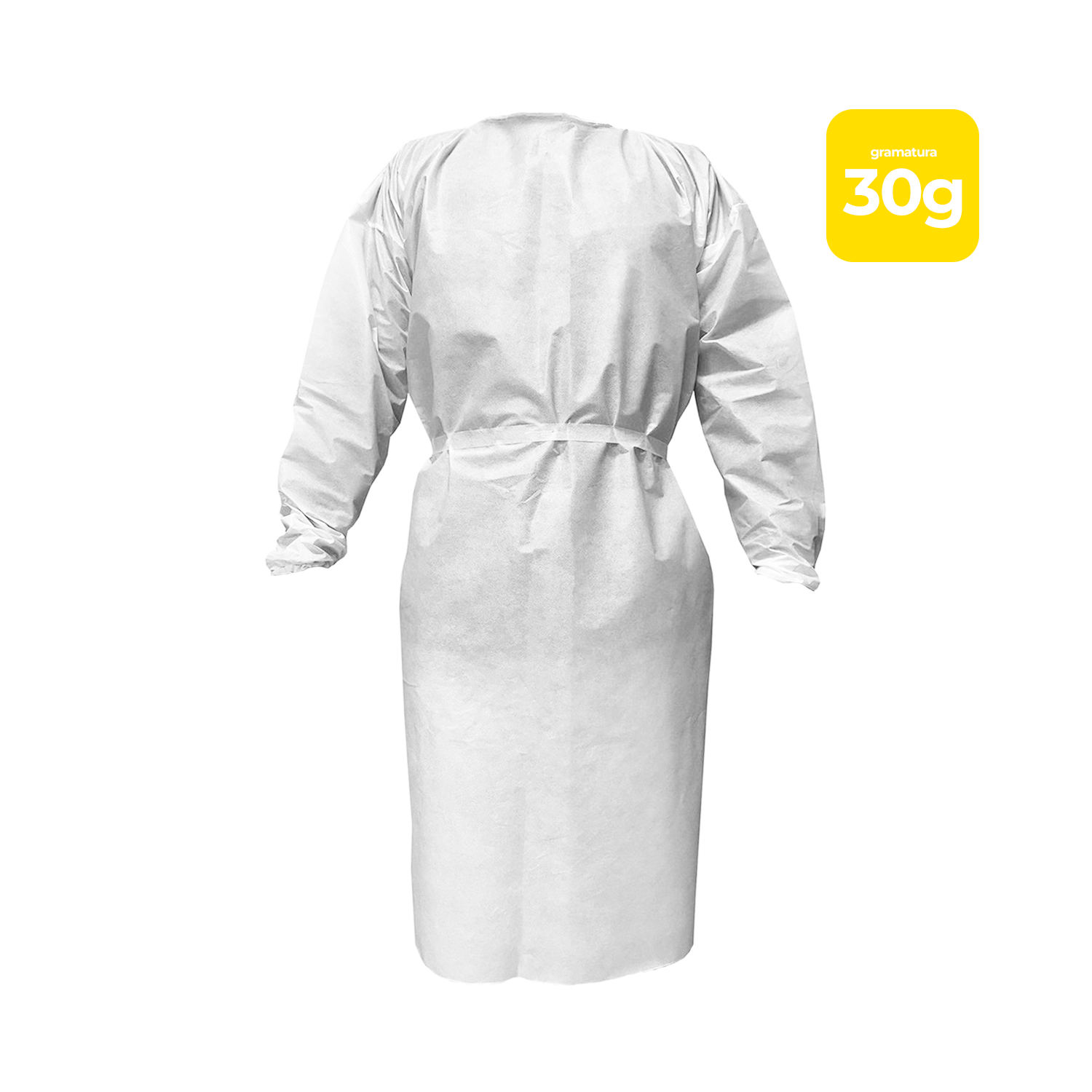 Avental descartável confeccionado em TNT (Tecido Não Tecido), ajustável com tiras ou cintos embutidos para amarrar no pescoço e cintura.