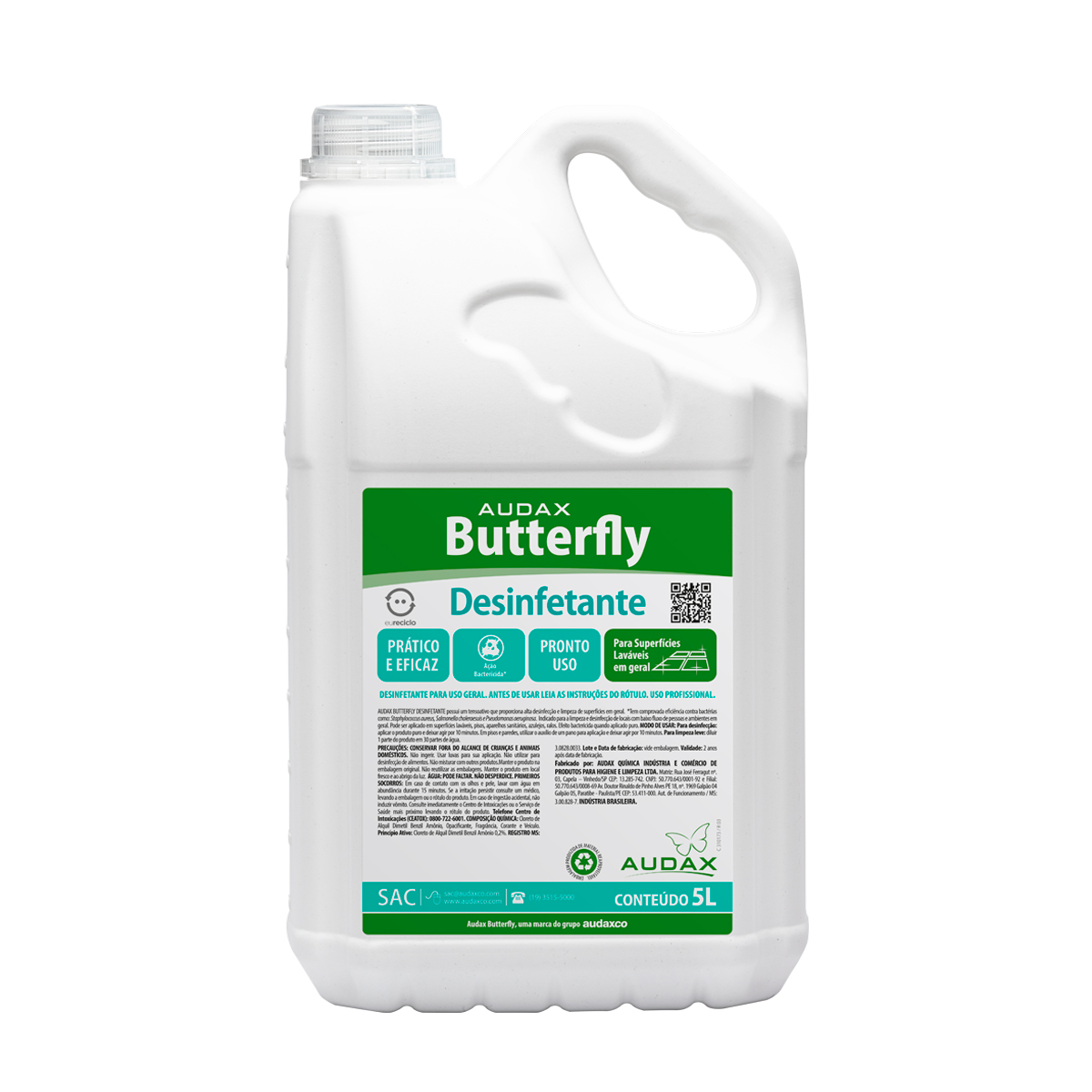 Desinfetante Butterfly Pinho 5L – Audax | Limpeza e Desinfecção Profissional | O Desinfetante Butterfly Pinho 5L Audax é formulado com tensoativo de alta eficiência, garantindo limpeza e desinfecção completa de superfícies. Com eficácia comprovada contra bactérias como Staphylococcus aureus, Salmonella e Pseudomonas aeruginosa, é ideal para manter ambientes limpos, higienizados e perfumados. | Perfeito para locais com baixo fluxo de pessoas, ele pode ser aplicado em superfícies laváveis, pisos, sanitários, azulejos e ralos, proporcionando efeito bactericida quando usado puro. | Especificações do Produto: | Embalagem: 5 litros | Tamanho da embalagem: 31 x 7 x 12 cm | Diluição: Pronto uso | Fragrância / Cor: Pinho Fresh / Verde | Benefícios: | Limpeza e desinfecção eficaz de pisos, azulejos, ralos e superfícies laváveis | Produto bactericida quando aplicado puro | Ideal para residências, escritórios, comércios e áreas de baixo fluxo | Perfume agradável de Pinho que deixa o ambiente fresco | Prático, econômico e fácil de aplicar | Mantenha seus ambientes limpos, higienizados e perfumados com o Desinfetante Butterfly Pinho 5L Audax, garantindo segurança e proteção contra germes e bactérias de forma prática e eficiente. | Código: -4721