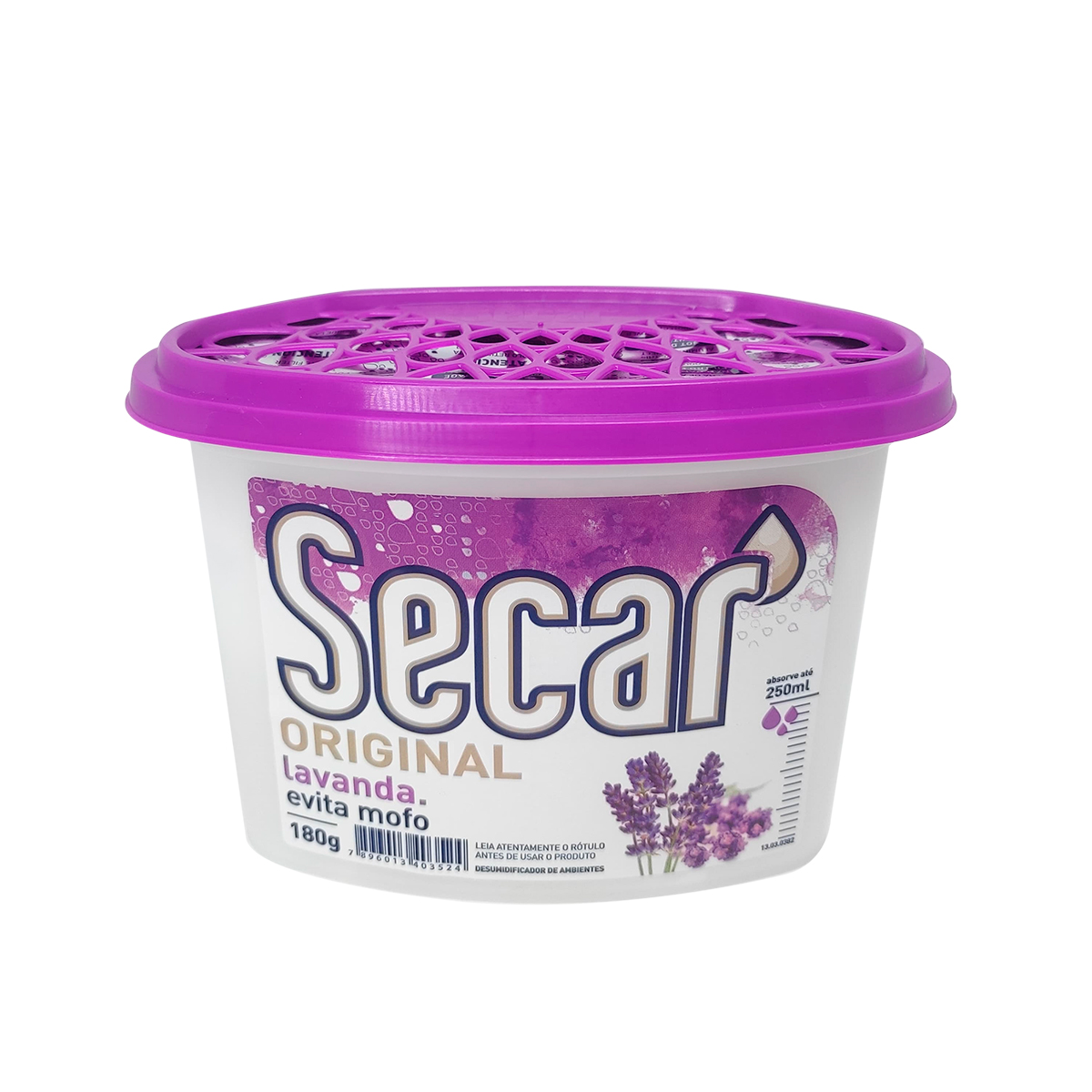 Evita Mofo Secar Original Lavanda 180g – Secar | O Evita Mofo Secar Original Lavanda 180g é a solução ideal para ambientes suscetíveis à umidade, como armários, gavetas, guarda-roupas e sapateiras. Sua fórmula elimina a umidade excessiva, prevenindo o aparecimento de mofo, fungos e odores desagradáveis, além de deixar uma fragrância floral suave | Marca: Secar | Modelo: Original Lavanda | Peso líquido: 180g | Tamanho da embalagem: 10,5 x 14 x 8 cm | Composição: Cloreto de cálcio e fragrância floral | Embalagem: Pote plástico com tampa | Uso indicado: eliminar umidade e odores em ambientes internos como armários, gavetas e sapateiras | Benefícios: Ação dessecante eficaz: combate a umidade prevenindo mofo e bolor | Fragrância floral suave: proporciona um aroma agradável ao ambiente | Fácil de usar: basta posicionar no local desejado | Design compacto: ideal para espaços pequenos e fechados | Proteção duradoura: age continuamente enquanto ativo | Código:-9629