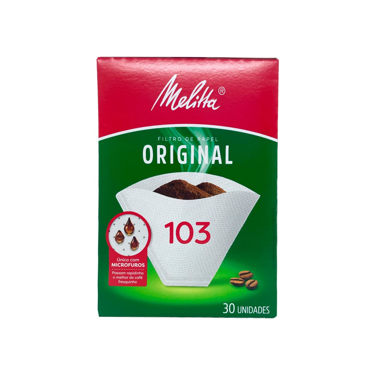 Filtro de Papel Nº 103 com 30 Unidades Melitta | O Filtro de Papel Melitta Nº 103 é ideal para quem aprecia um café coado com sabor e aroma intensos. Sua tecnologia exclusiva de microfuros permite a passagem ideal da água, realçando o sabor e aroma do café. Compatível com suportes tamanho 103, é perfeito para preparar de 4 a 6 xícaras de café. | Benefícios: • Tecnologia de microfuros que proporciona extração uniforme do café. • Produzido com 100% fibras celulósicas, garantindo um café livre de impurezas. • Produto descartável, facilitando a limpeza e evitando contaminações. • Biodegradável e eco-friendly, contribuindo para a preservação ambiental. | Especificações: • Quantidade: 30 unidades. • Tamanho: 103 (ideal para preparar 1000ml ou 20 xícaras de café). • Composição: 100% fibras celulósicas. • Cor: Branco. • Marca: Melitta. • Modelo: Original. • Dimensões (A x L x P): 2,0 x 15,4 x 20,5 cm. • Peso Aproximado: 84,0 gramas. | Código: -2723