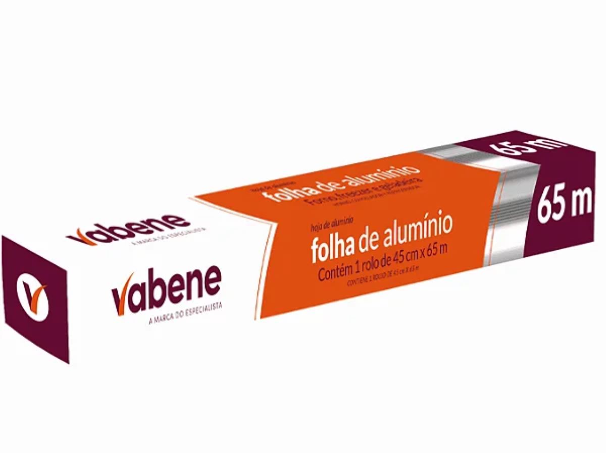 "Papel alumínio 45cm x 65m para embalar alimentos, cozinhar e proteger. Marca Vabene: qualidade e durabilidade. Compre agora!"
