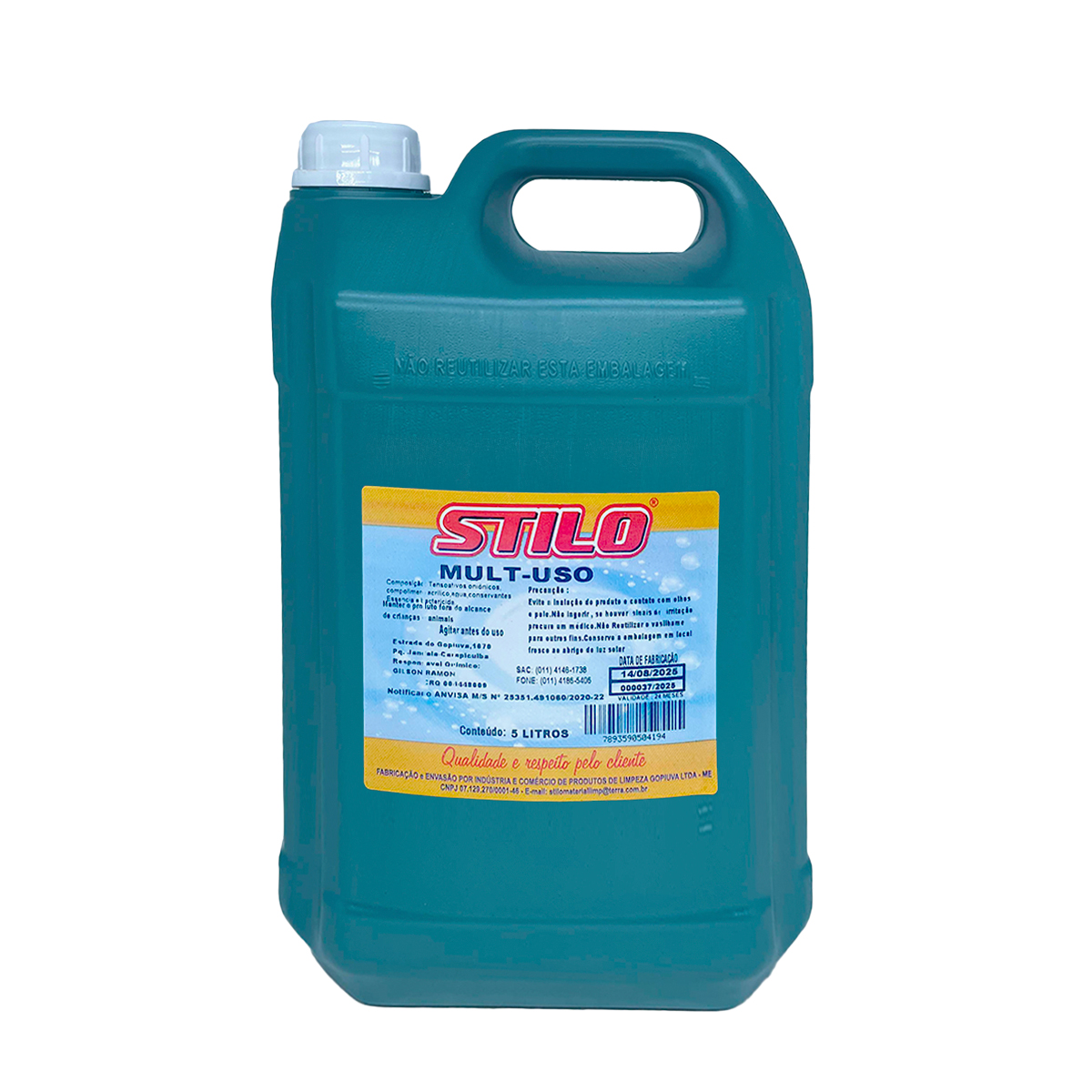 Limpador Multiuso 5L Stilo | Solução eficaz para limpeza em larga escala, ideal para residências, escritórios e estabelecimentos comerciais. | Benefícios | Limpeza eficaz e rápida | Deixa os ambientes com aroma agradável | Fácil aplicação | Secagem rápida | Características do Produto | Volume: 5 litros | Tipo: Líquido | Uso: Pronto para uso | Indicação: Limpeza de superfícies laváveis, incluindo pisos, azulejos, fórmica, plástico e esmaltado | Fragrância: Sem fragrância | Embalagem: Frasco de 5 litros | Tamanho da embalagem: 28 x 18 x 12 cm | Modo de Uso | Aplicar diretamente na superfície | Espalhar com pano limpo ou flanela de microfibra para brilho | Código:-9313