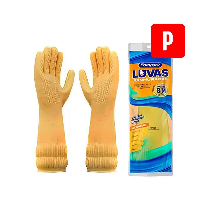 "Confeccionada em borracha natural (látex) as luvas ranhuradas Bompack protegem suas mãos de produtos químicos e detergentes, especialmente nas operações de limpezas básicas. A palma antiderrapante e super-reforaçada oferece melhor firmeza no manuseio de produtos e peças escorregadias. O punho totalmente ranhurado, além de proteger o antebraço, proporciona melhor ajuste da luva nas mãos e maior conforto durante o uso. As luvas ranhuradas Bompack são ideais para uso doméstico e industrial, especialemente, nos frigoríficos e avícolas.