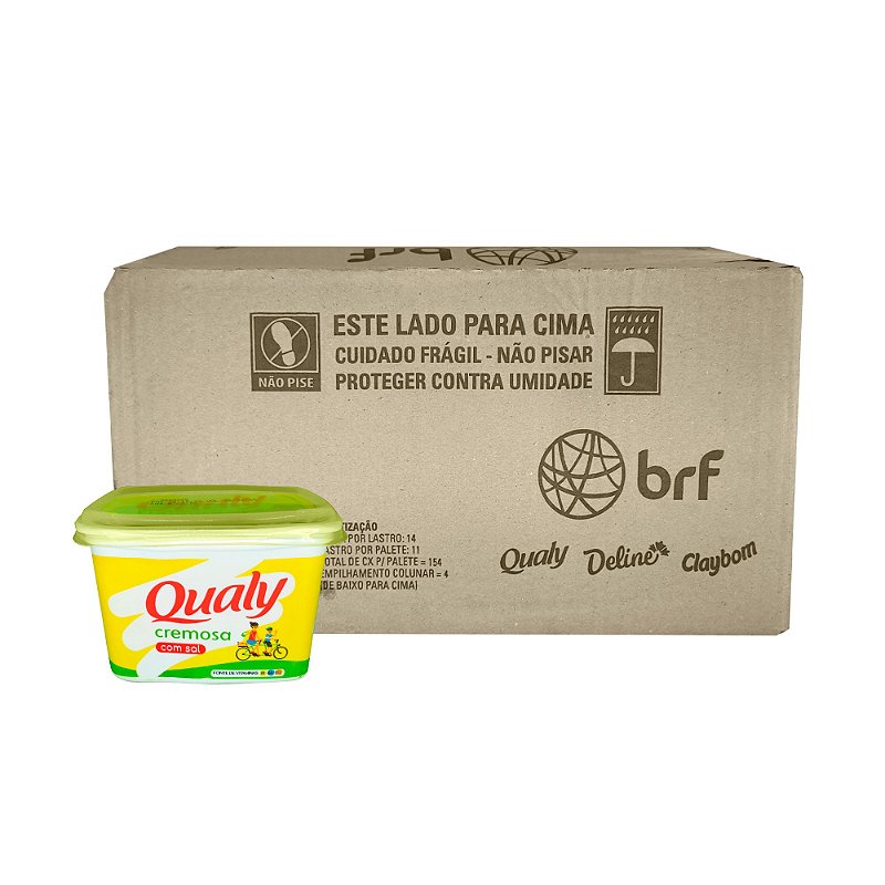 Margarina Qualy Cremosa com Sal 500g Caixa com 12 Unidades | A Margarina Qualy Cremosa com Sal é a escolha ideal para quem busca frescor, maciez e sabor amanteigado em suas refeições | Com 80% de lipídios, ela deixa seus pães, bolos, tortas e massas folheadas mais saborosos, macios e suculentos, garantindo um dourado especial e crocância que fazem toda a diferença no preparo | Frescor e sabor amanteigado incomparável | Textura cremosa que facilita o uso | Realça o sabor e a textura de bolos, tortas e pães | Proporciona um dourado perfeito para assados e grelhados | Ideal para o café da manhã e lanches variados | Peso: 500g por unidade | Quantidade: Caixa com 12 unidades | Contém sal | Composição rica em lipídios (80%) | Código: -1765
