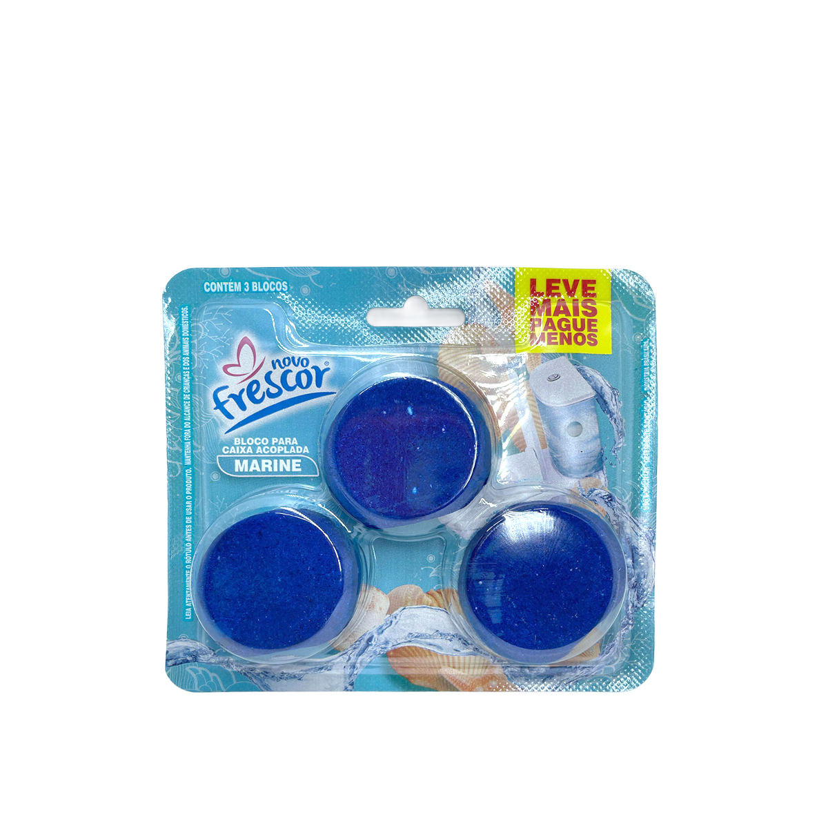 Bloco Sanitário Triplo para Caixa Acoplada Marine 45g – Novo Frescor | Limpeza eficaz e perfume refrescante que dura | Ação tripla para caixas acopladas, prevenindo sujeira e odores | Fragrância marine energizante que renova o ambiente e traz sensação de frescor | Produto econômico, fácil de aplicar e de alta qualidade | Ideal para residências, condomínios, escritórios, clínicas, escolas e estabelecimentos comerciais | Mantém o banheiro sempre agradável e livre de odores | Peso: 45g | Fragrância: Marine | Linha: Econômica Novo Frescor | Tipo: Bloco sanitário triplo para caixa acoplada | Tamanho do bloco: 4,8cm diâmetro x 2cm altura | Embalagem: 16x14x2cm | Código: -9210