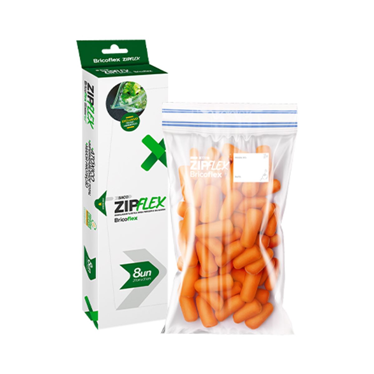 Produzido em plástico e com fechamento tipo zip, é apresentado em pacote com 8 unidades da marca BRICOFLEX.
